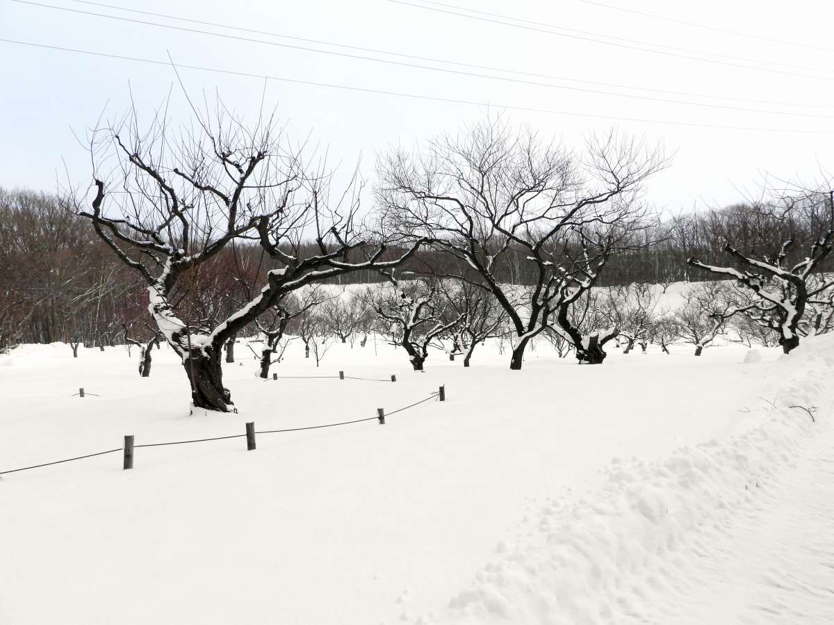 梅園では、除雪されている部分の園道を歩いてみましたが、野生動物の足跡があるだけで、野鳥にはあえませんでした。
