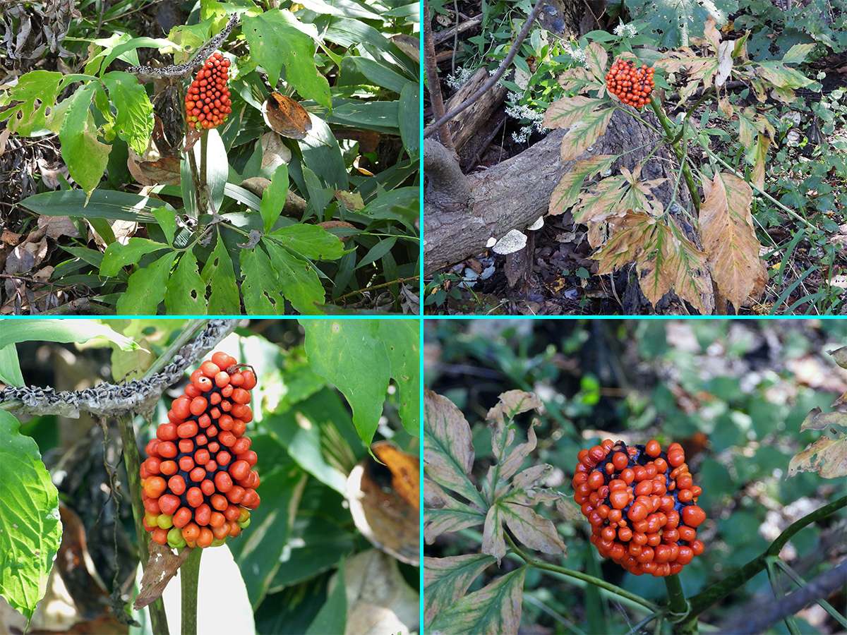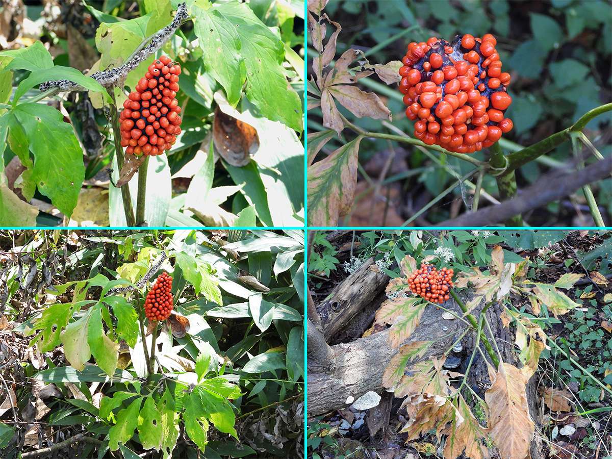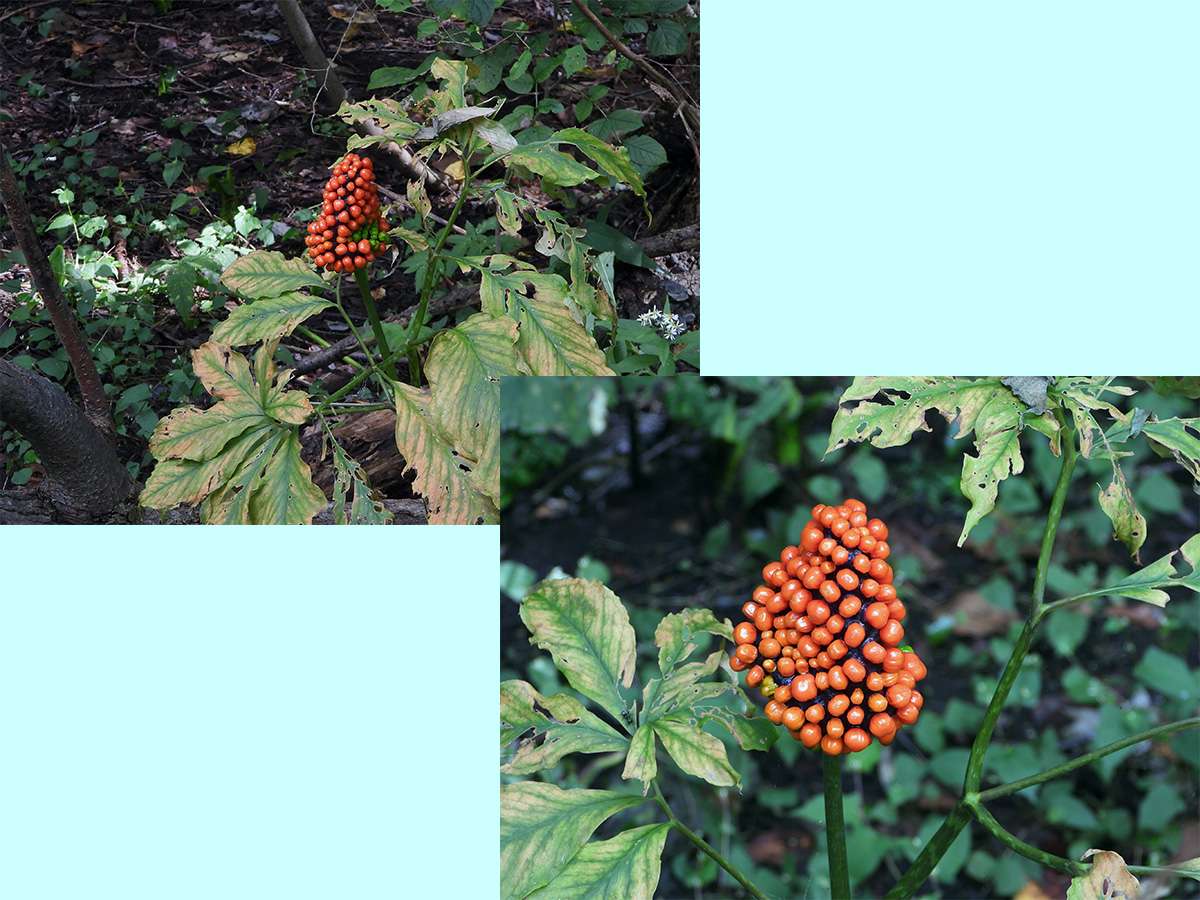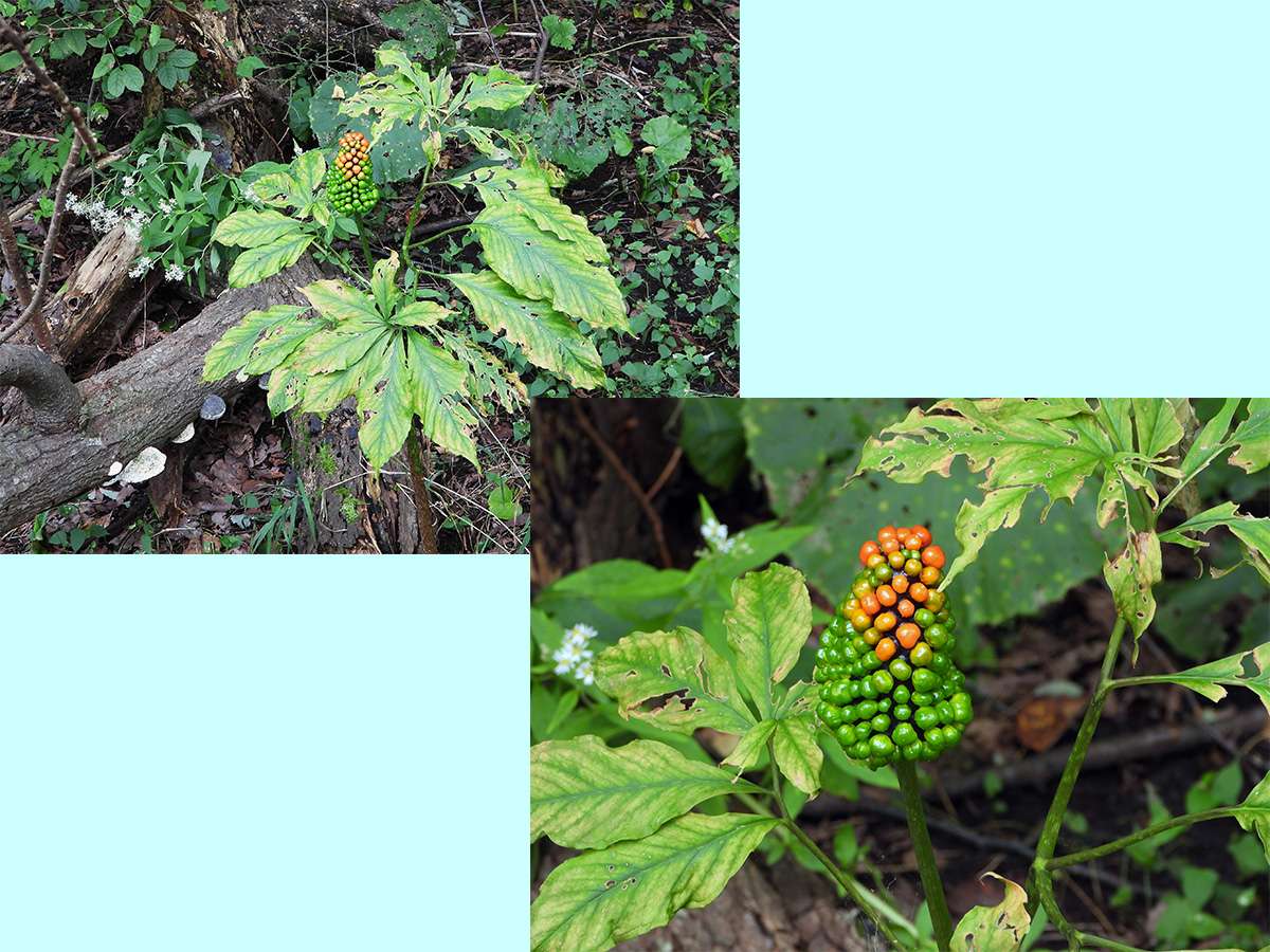最初に見つけたマムシ草は、葉も枯れてきて、すこし落果が目立つようになりました。(写真5右側上下)