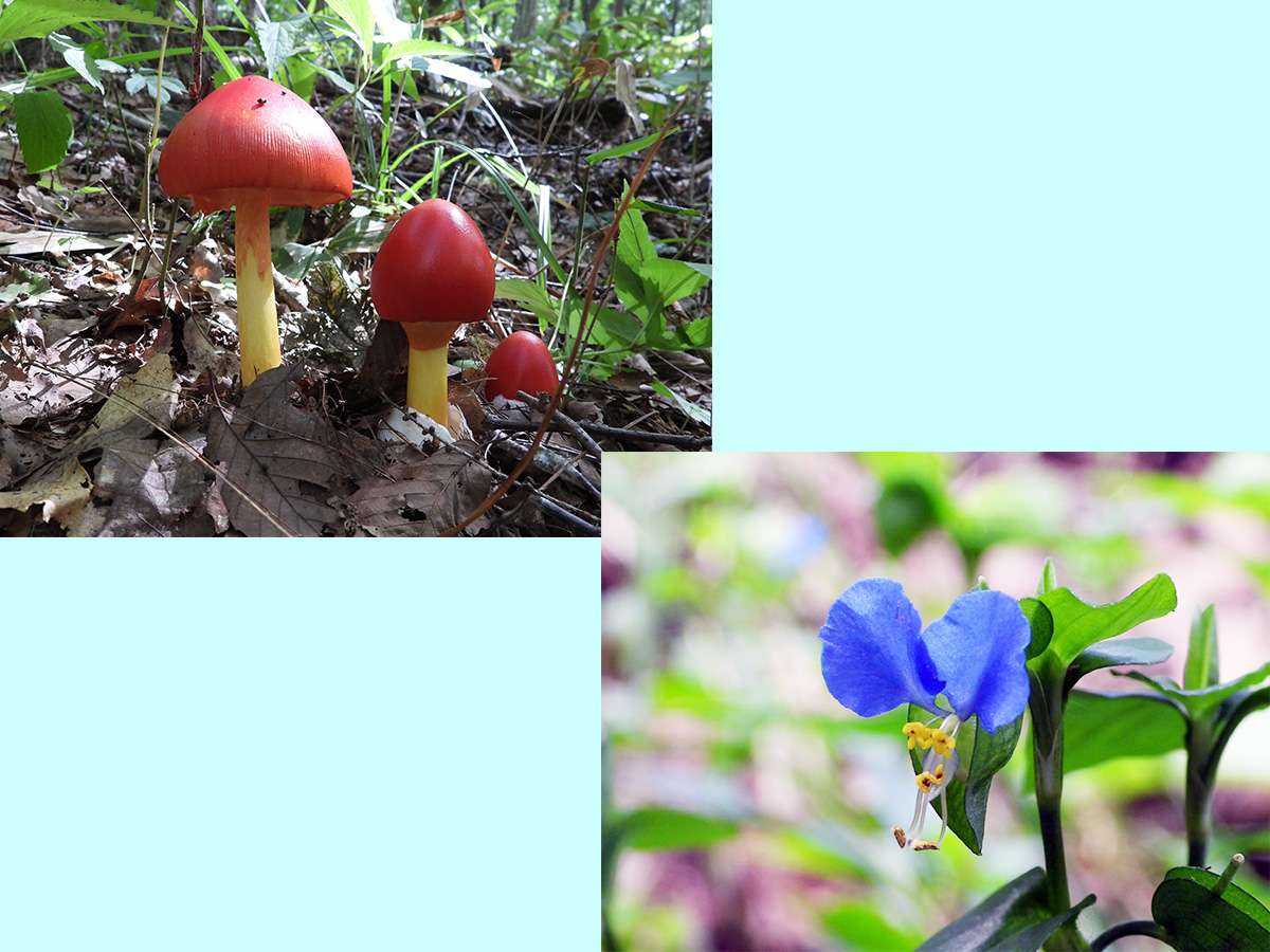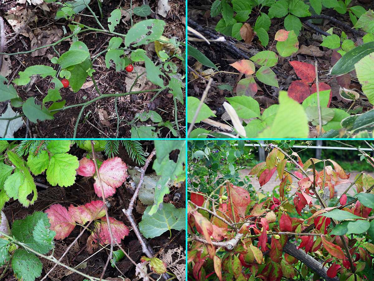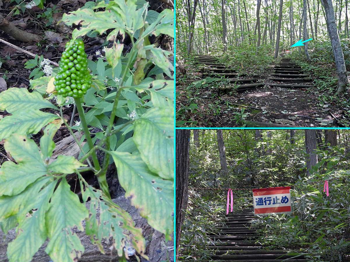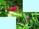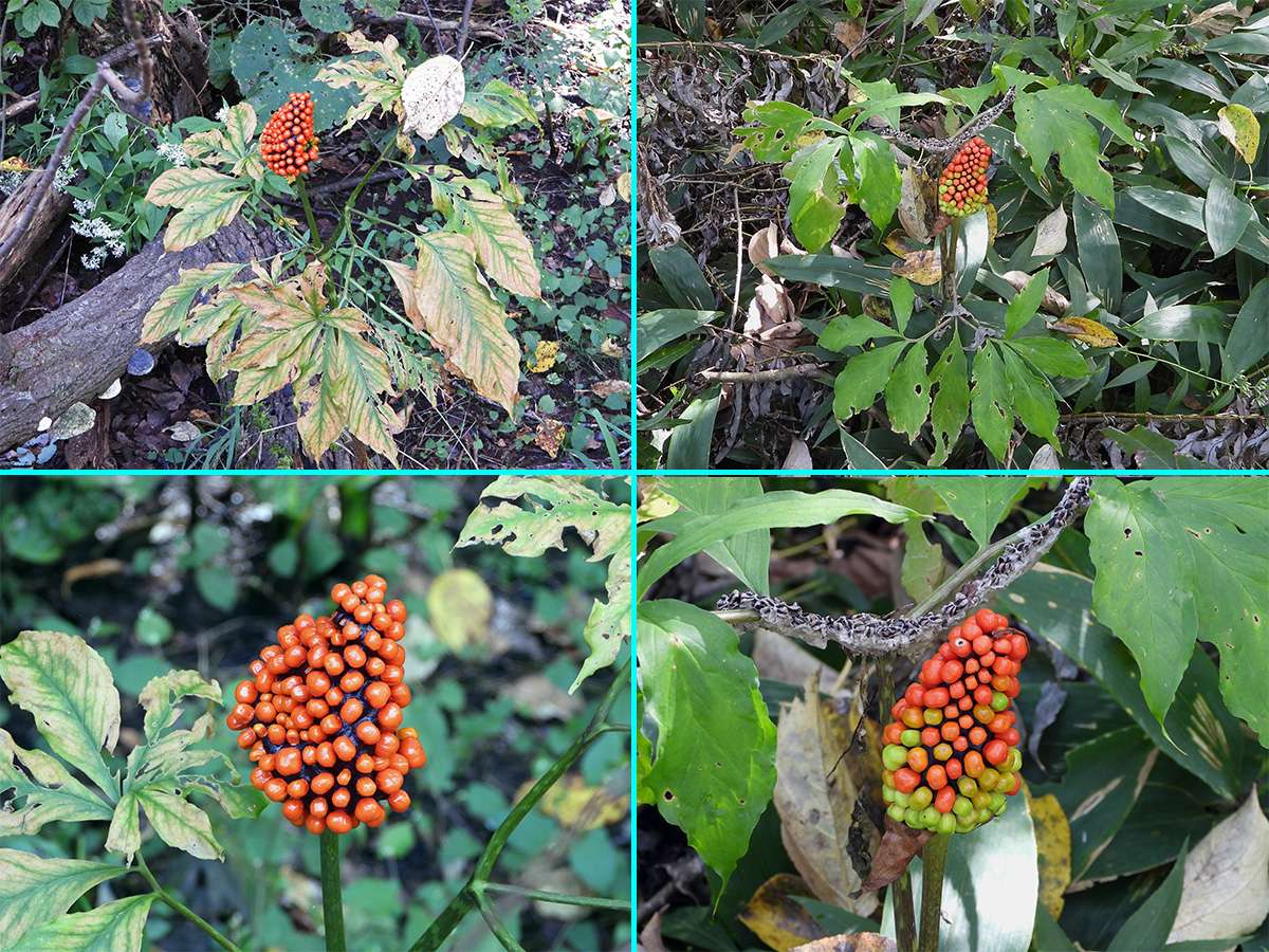 最初に見つけたマムシ草は、葉も枯れてきて、すこし落果が目立つようになりました。(写真5右側上下)