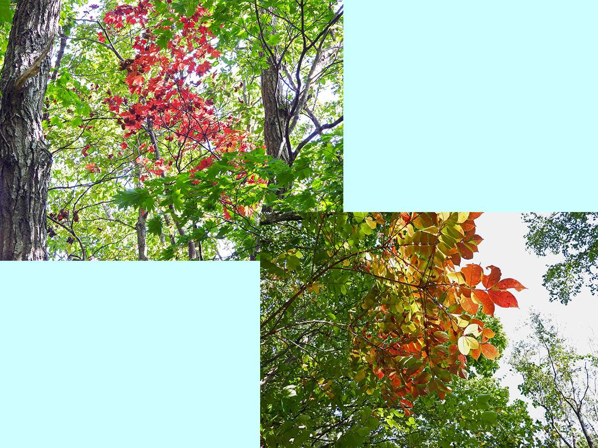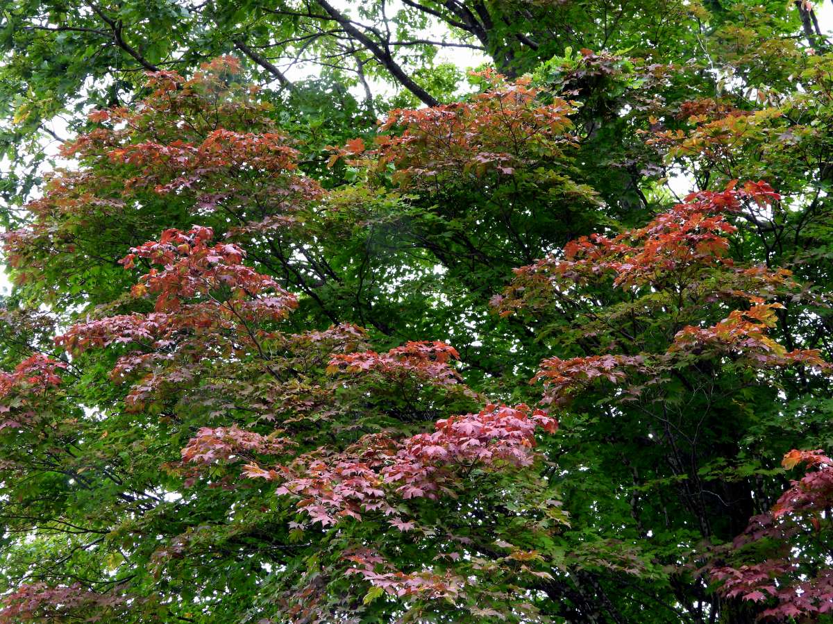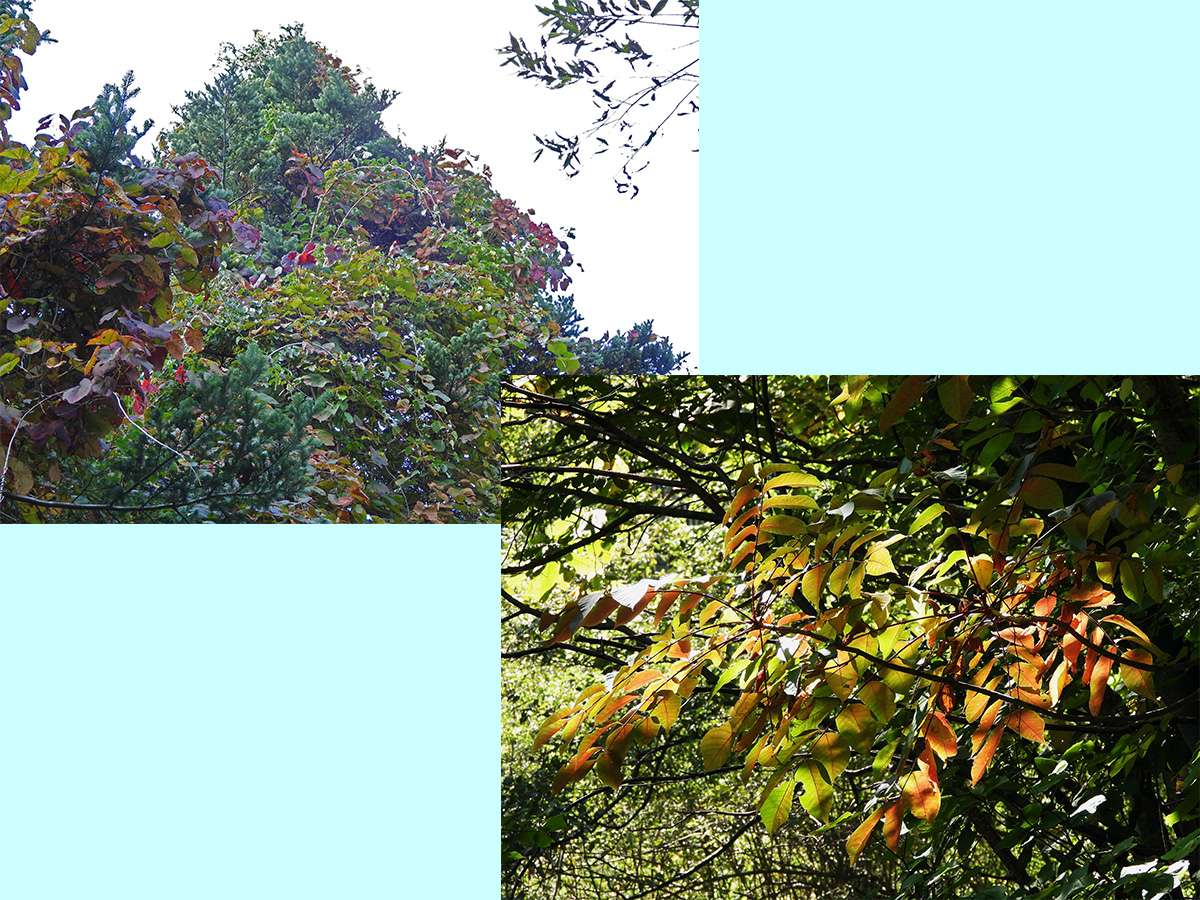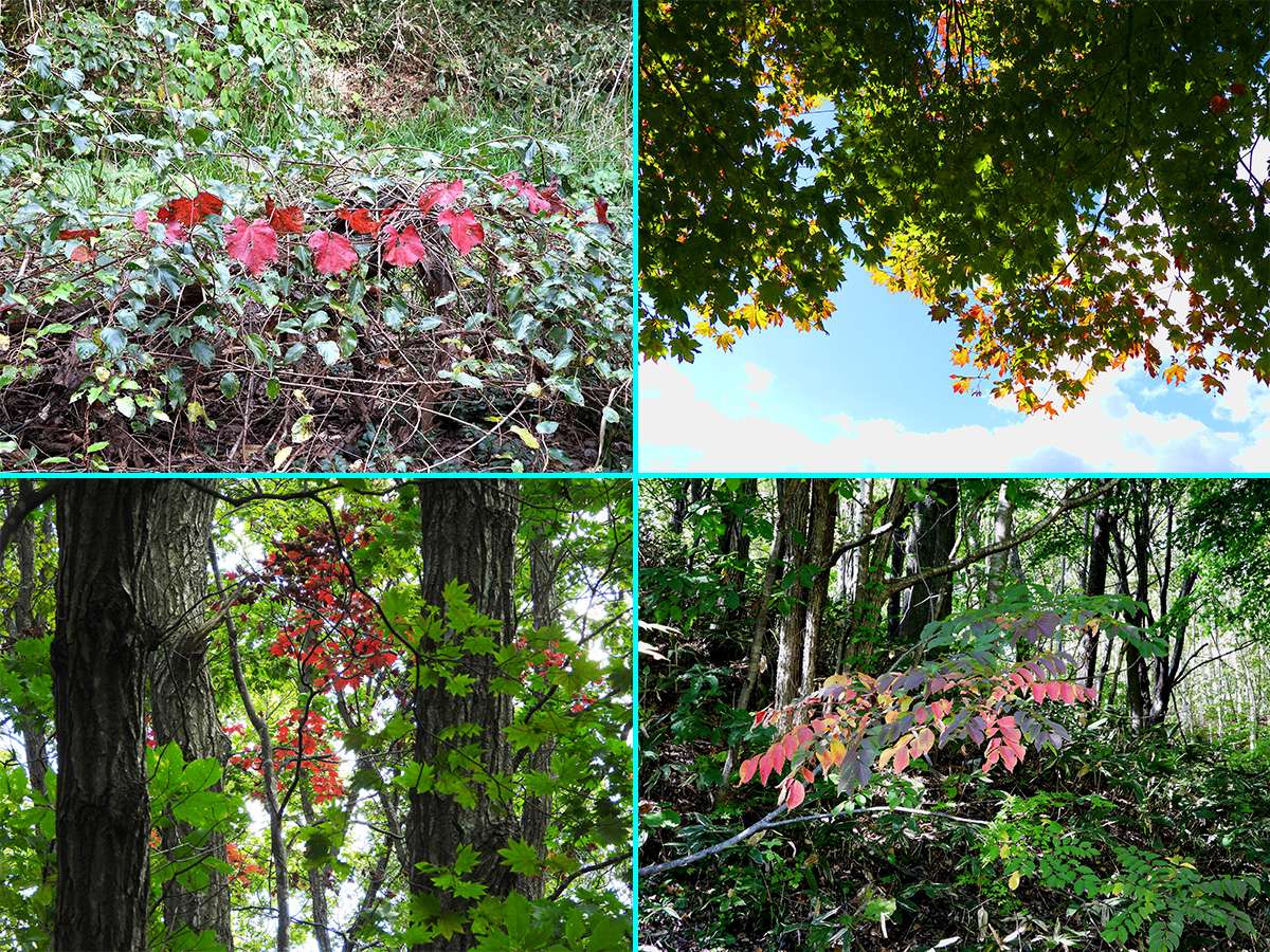 林の中の遊歩道を歩いているときに、真紅に紅葉している高木を見つけました。(写真7:上段)