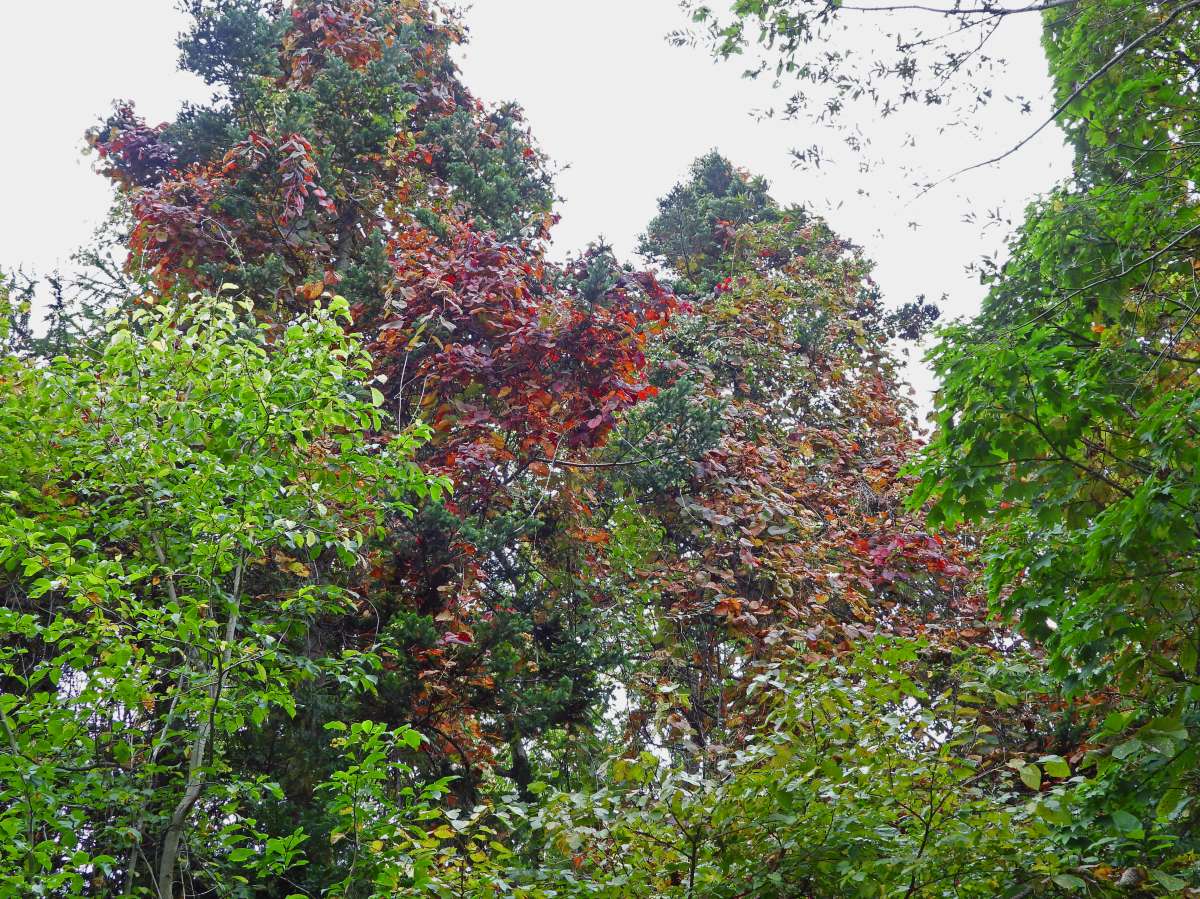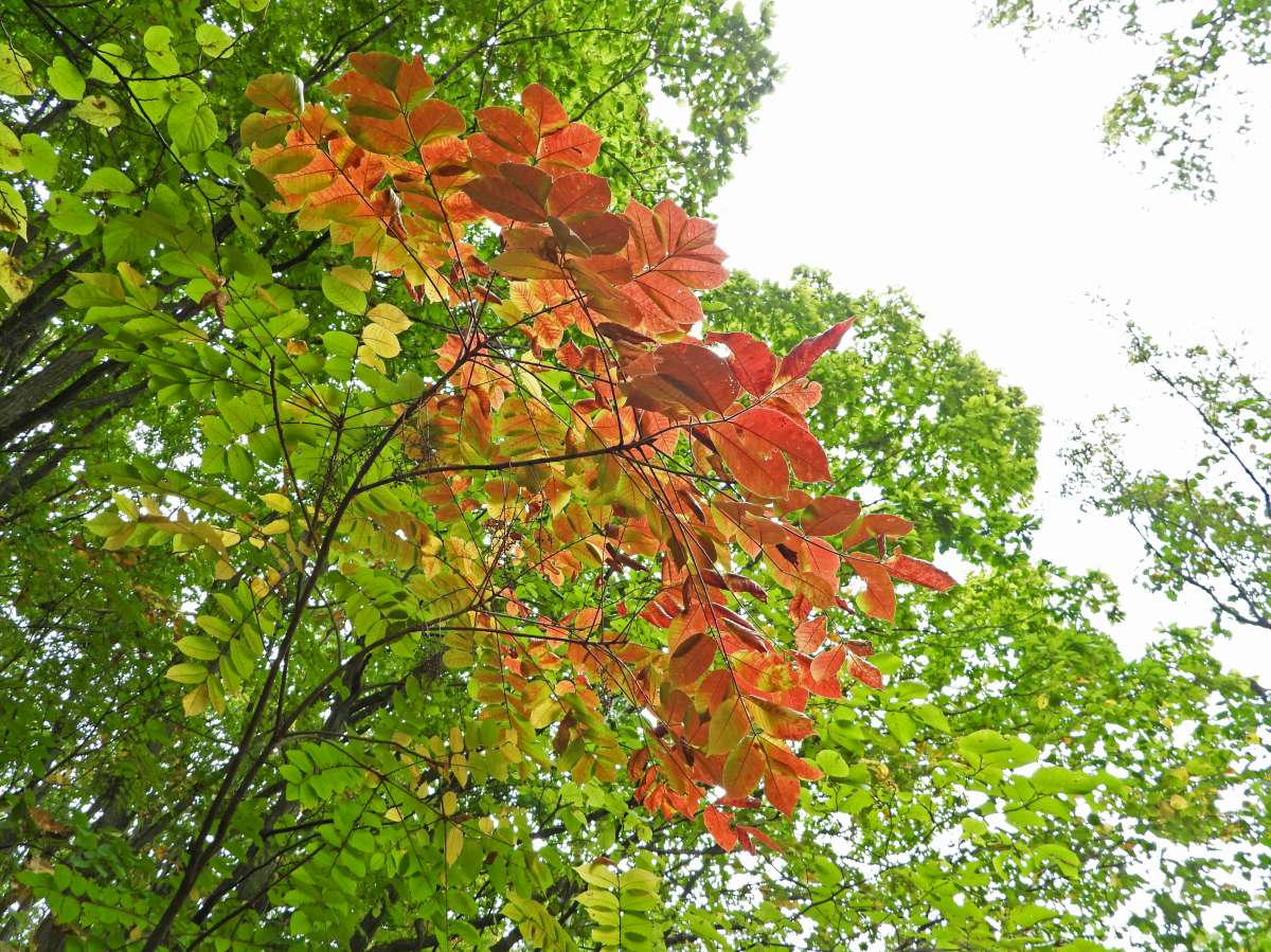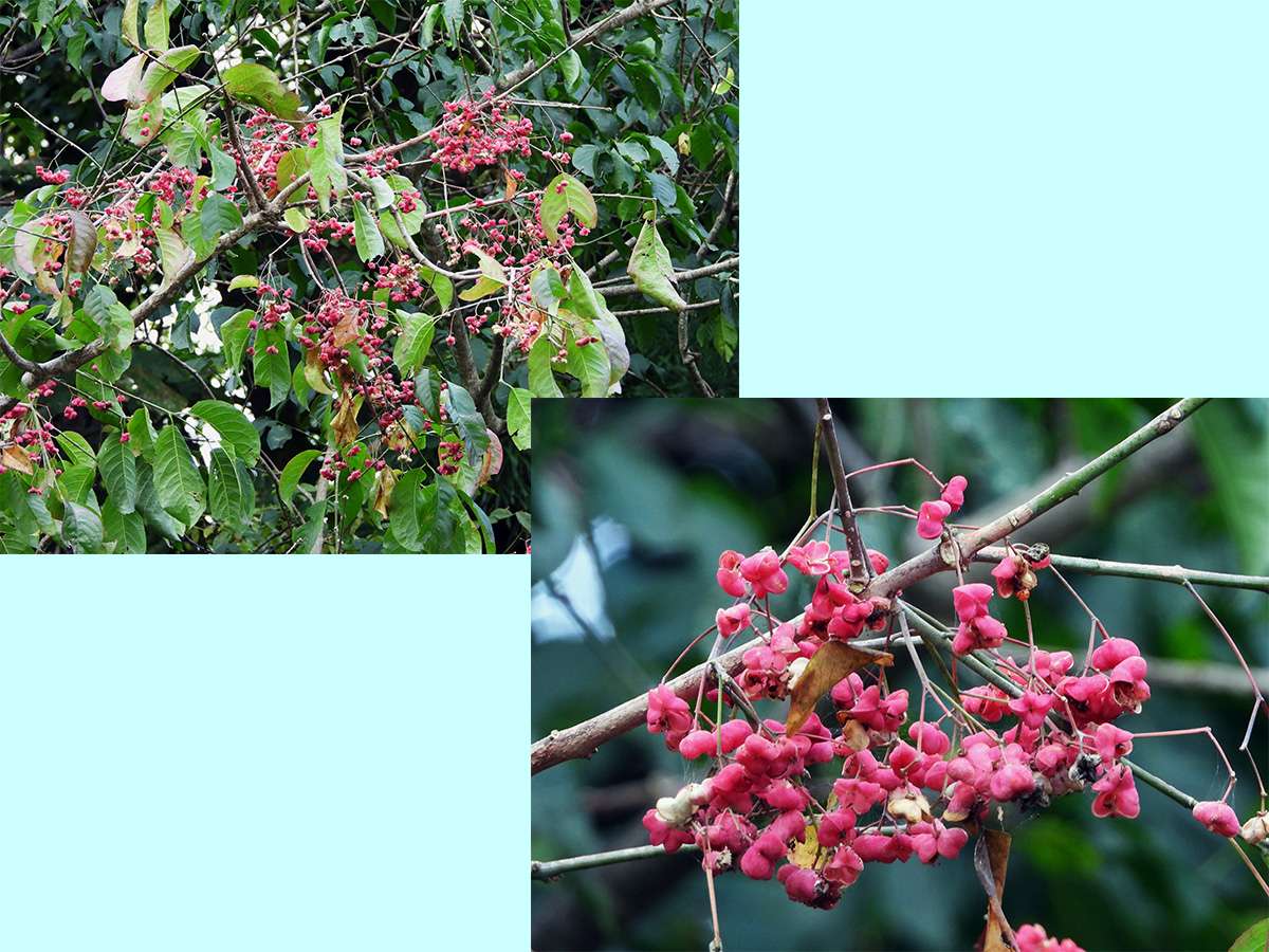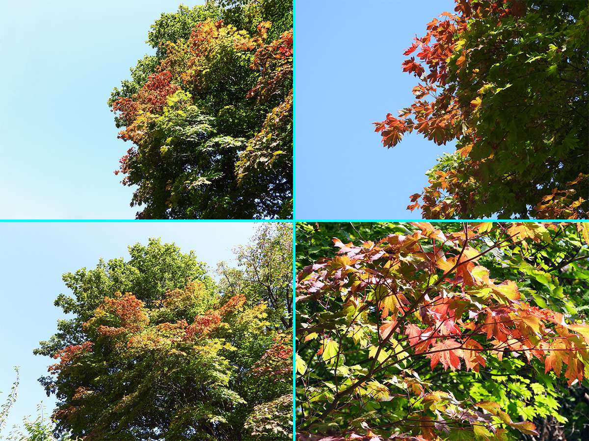 林の中の遊歩道を歩いているときに、真紅に紅葉している高木を見つけました。(写真7:上段)